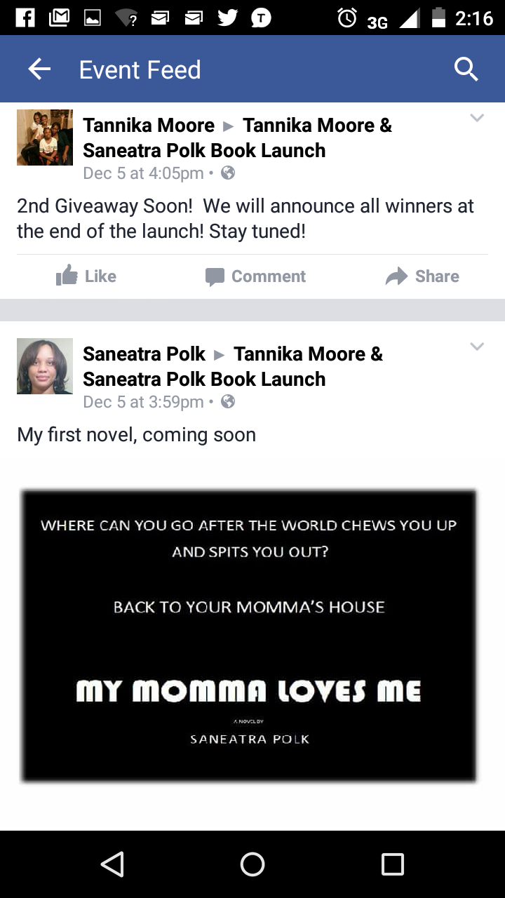 December 5th, I teamed up with my bestie, Saneatra Polk, to host our first book launch, a virtual one via Facebook. We were excited to have found that such a platform existed for writers, possibly shy ones like ourselves. Hey, we have to start somewhere and we heard these book launches are just as fun and meaningful.