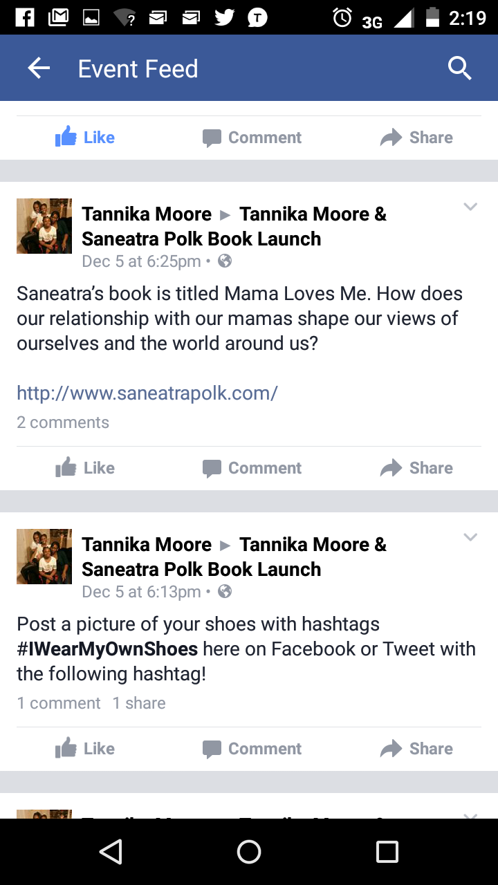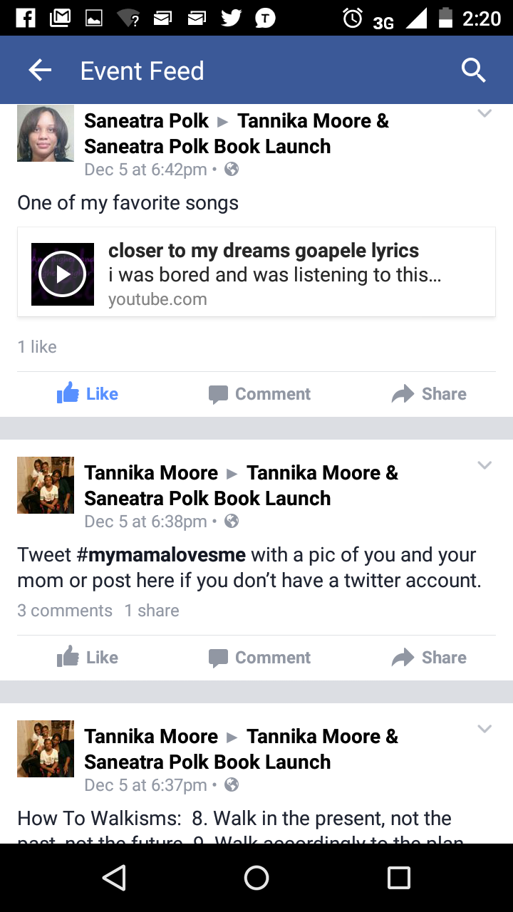 The guests, Saneatra and I had a ball! Some also expressed that having a book launch on Facebook was a great idea. For all those who came out to our party on Facebook from the comfort of their homes or out and about, thank you for taking the time to have a blast with us! We appreciate it so much. Check out these pictures from some of the posts made at our party.