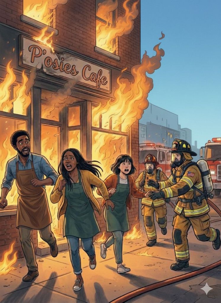 The daytime crew made it to the door of the small quaint coffee shop. Sirens of a fire truck grew louder and then stopped as the fire truck came to a screeching stop right in front of the P’osies Café.